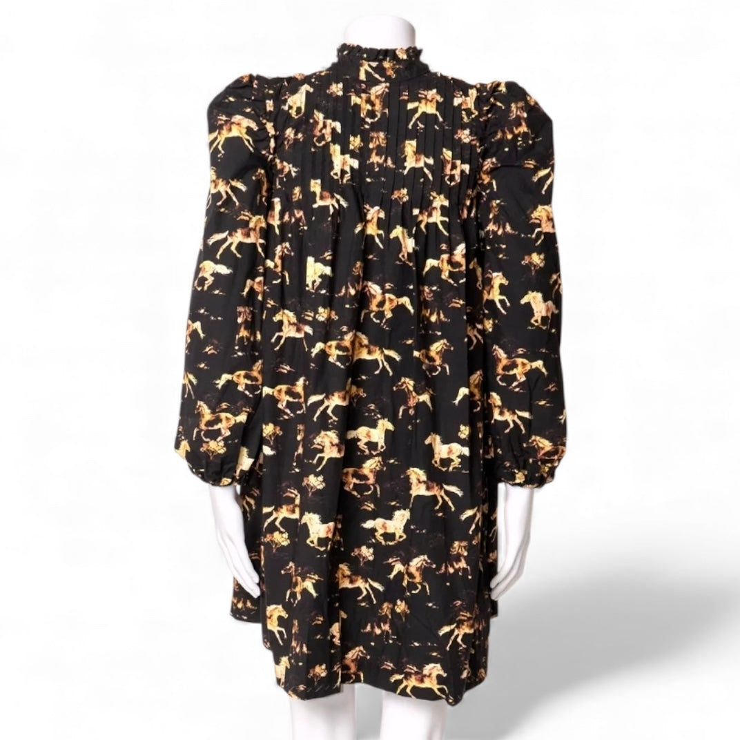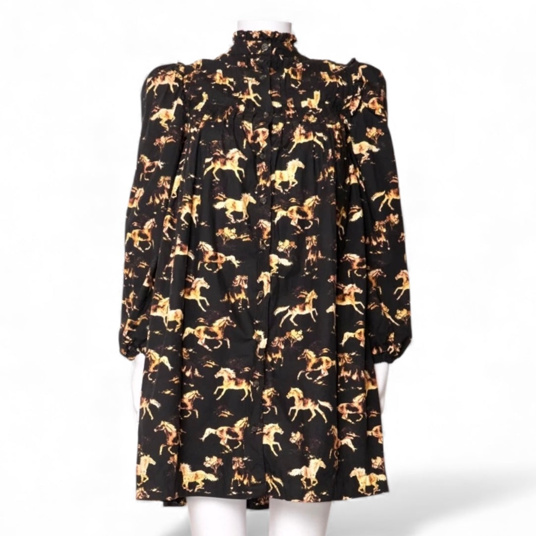 Ganni’s Ditte Reffstrup draws on childhood memories of watching Western films, captured on this blue dress with a galloping horse print. In tune with the label’s characterful aesthetic, it’s shaped to a smock silhouette with a ruffled neckline and features a pintucked bodice and voluminous balloon sleeves