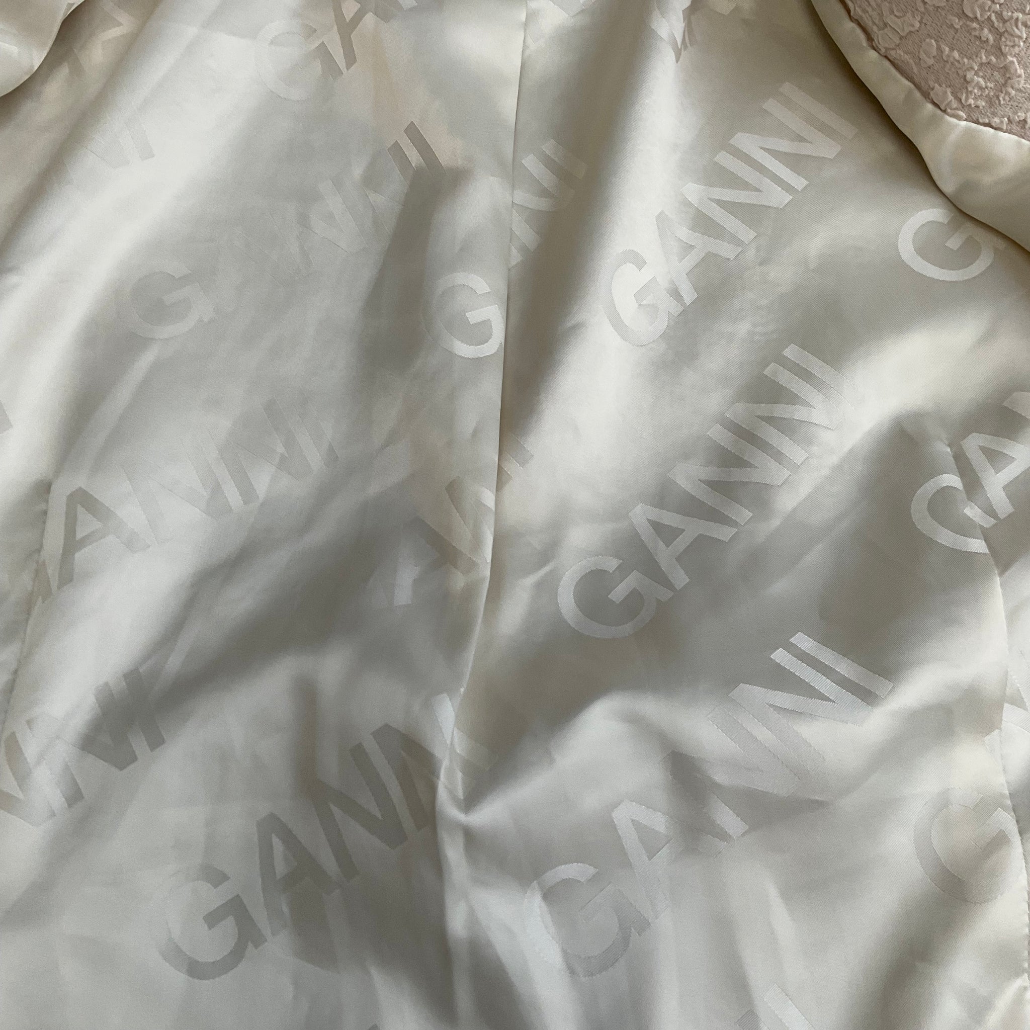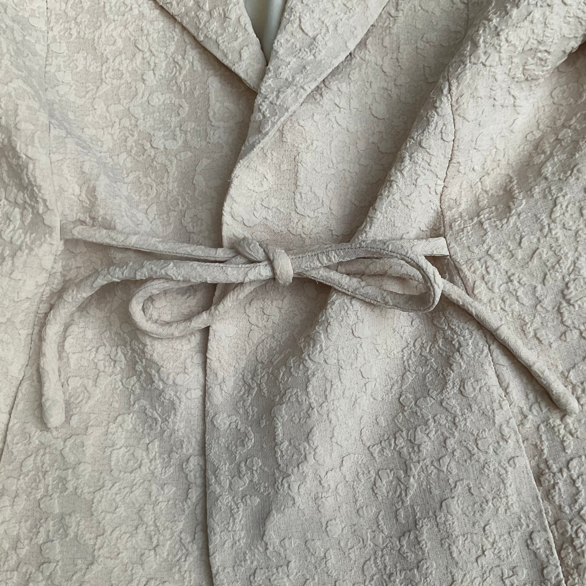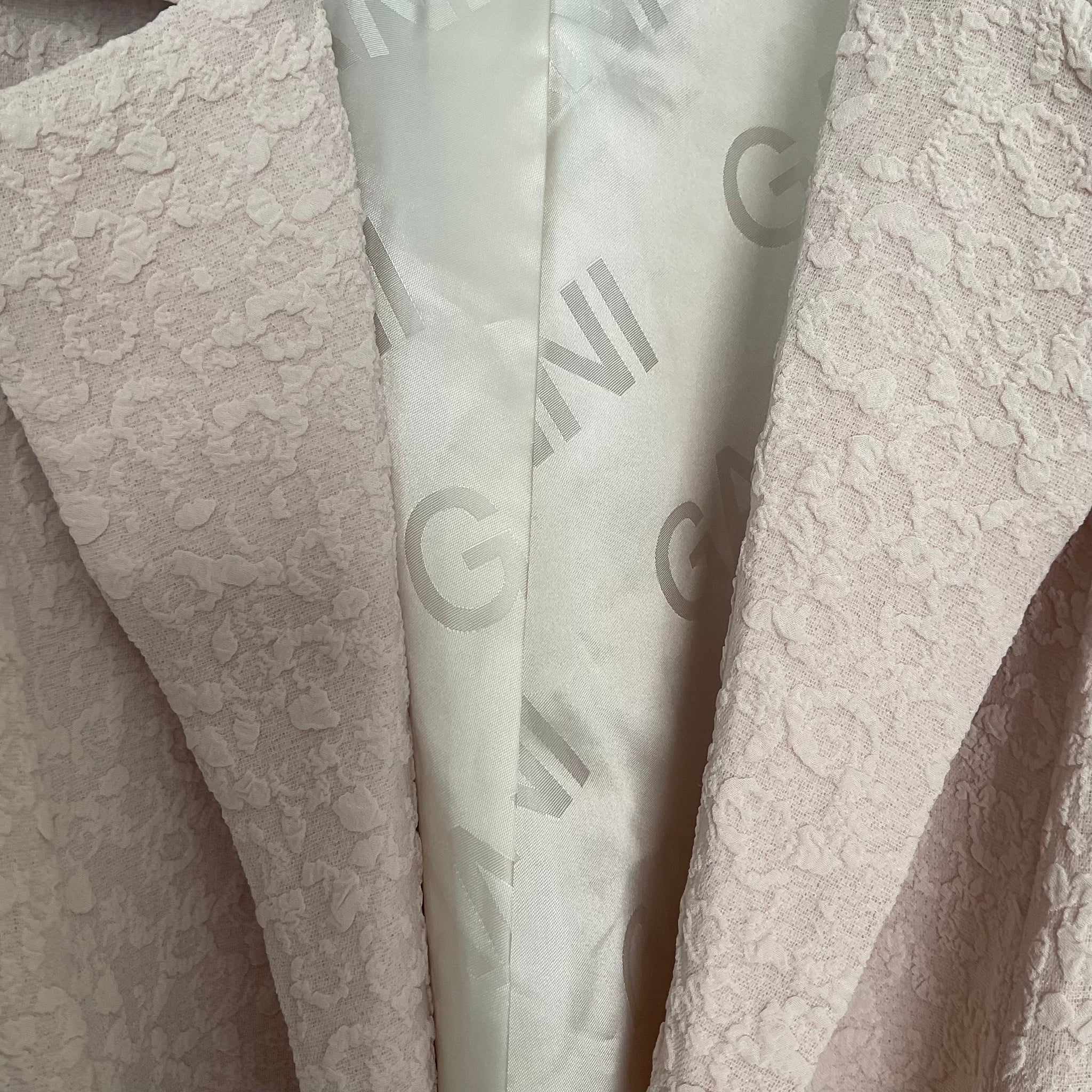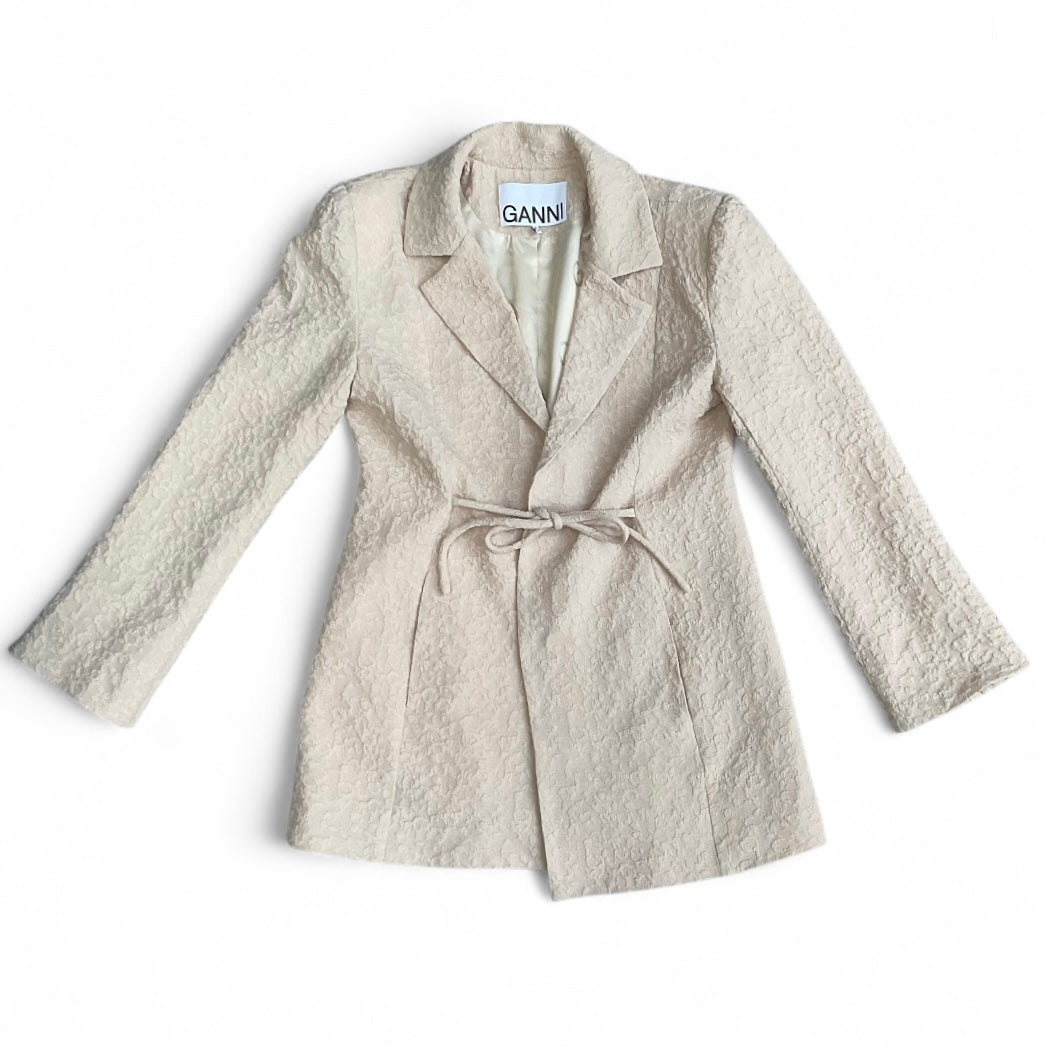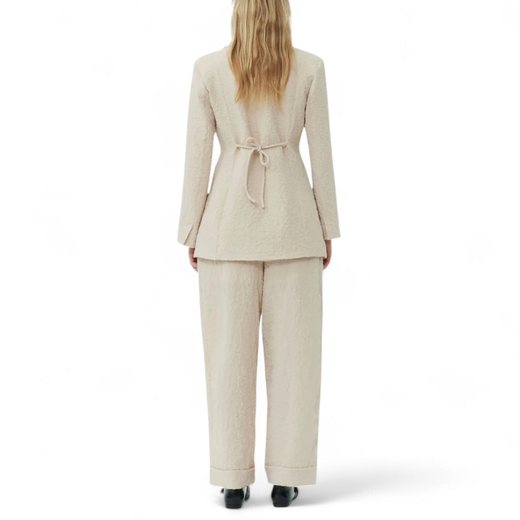 Ganni updates the classic single-breasted blazer. This garment fastens with tie strings on the front and back for versatility and is completed by a textured finish