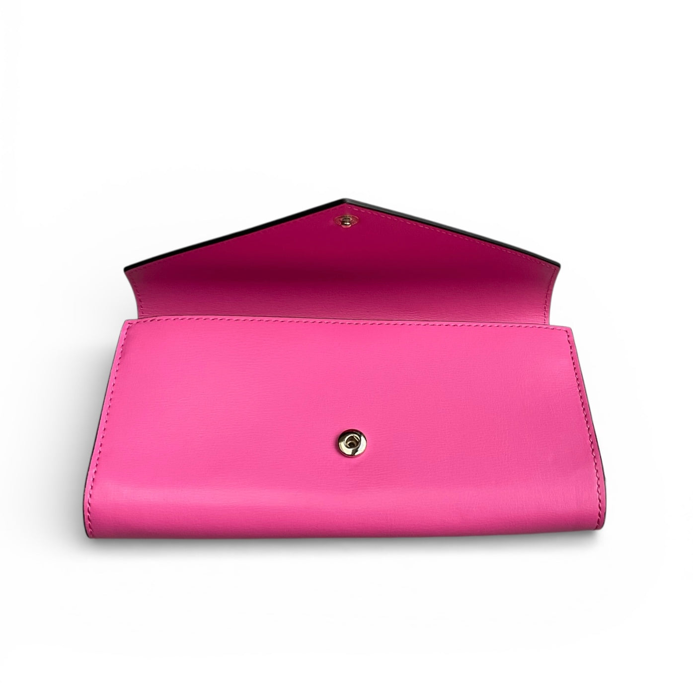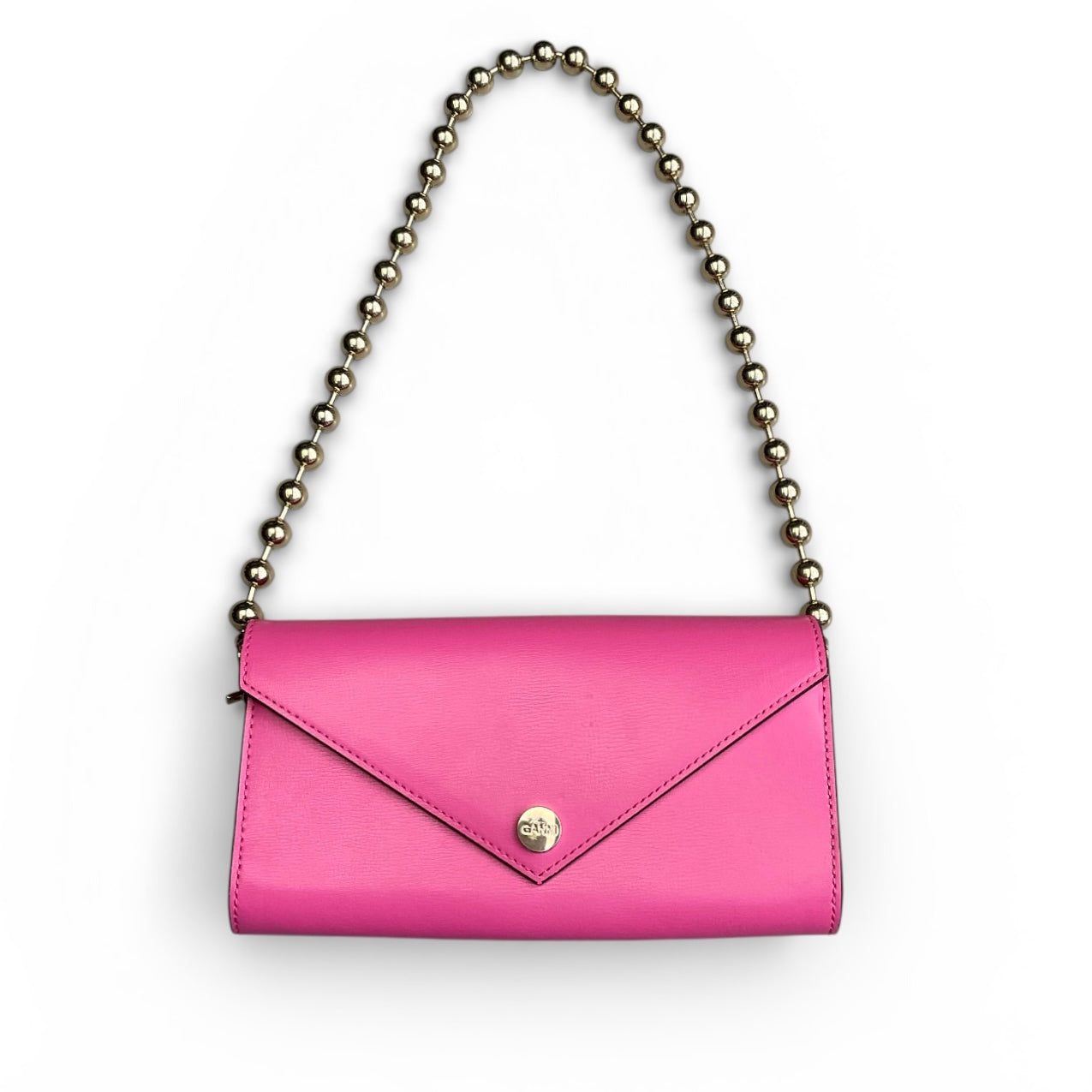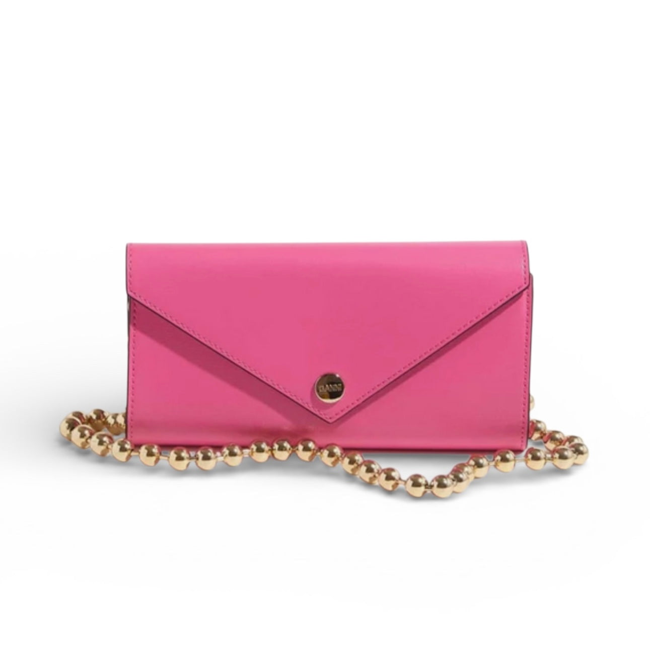 This Banner Envelope Chain Wallet features a foldover top, main compartment, chain-link shoulder strap, snap button closure