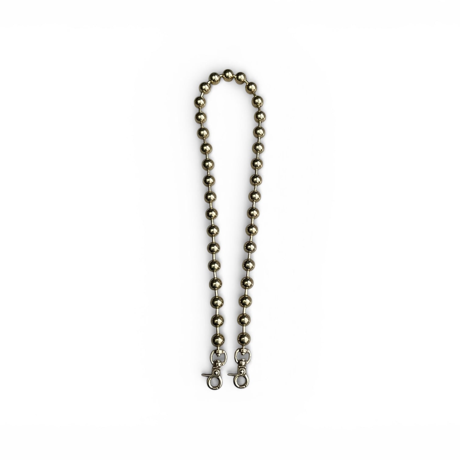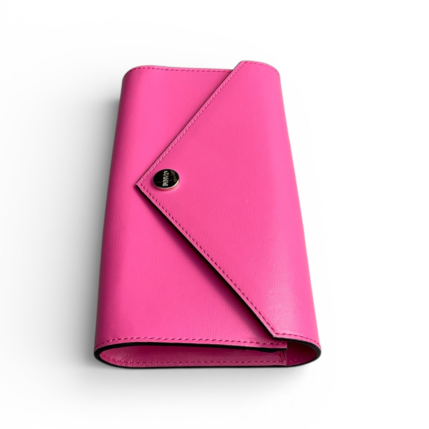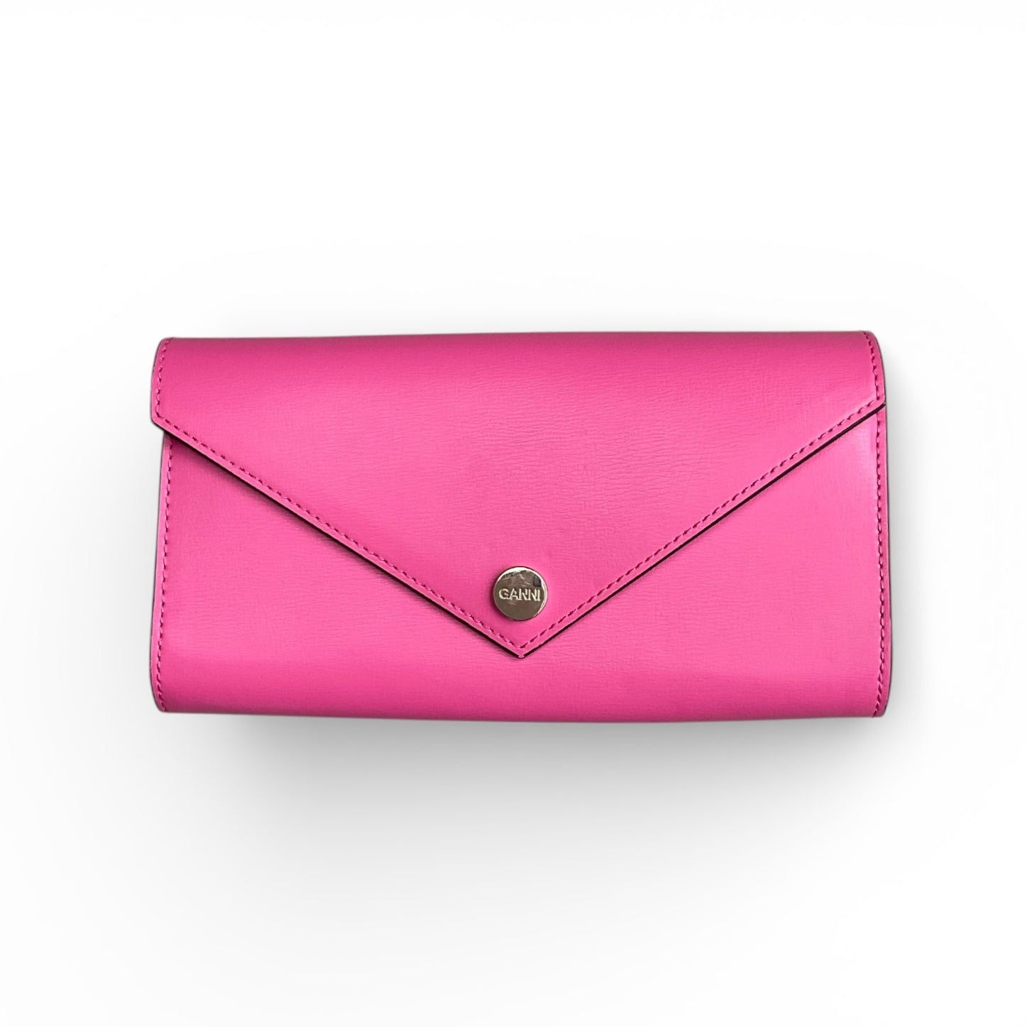 This Banner Envelope Chain Wallet features a foldover top, main compartment, chain-link shoulder strap, snap button closure