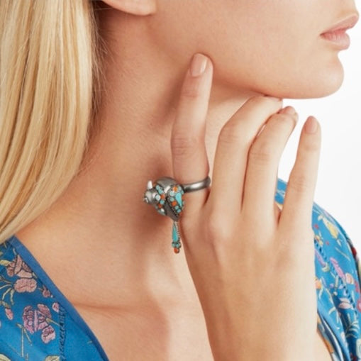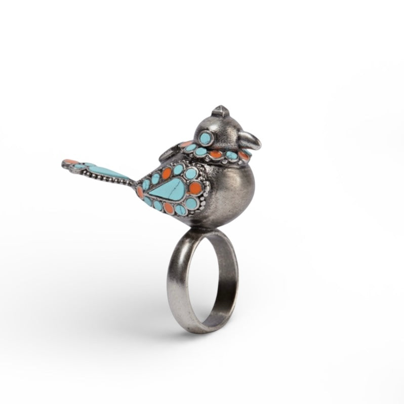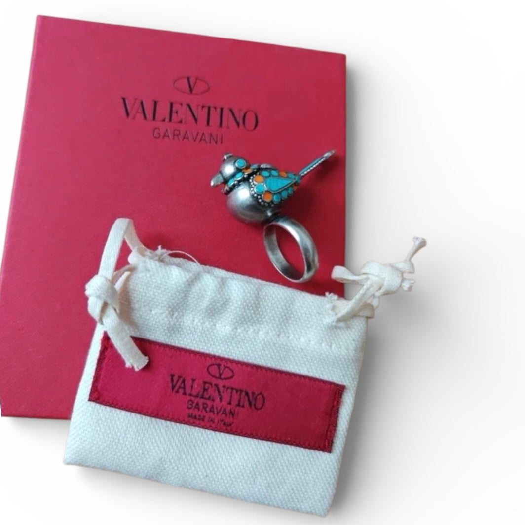 Valentino Garavani ring crafted in a polished silver-tone metal, the design features sculptural bird motif brought to life with vibrant blue and orange enamel detailing, as well as a signature “Rockstud”