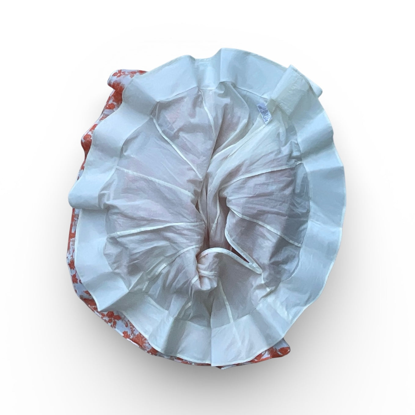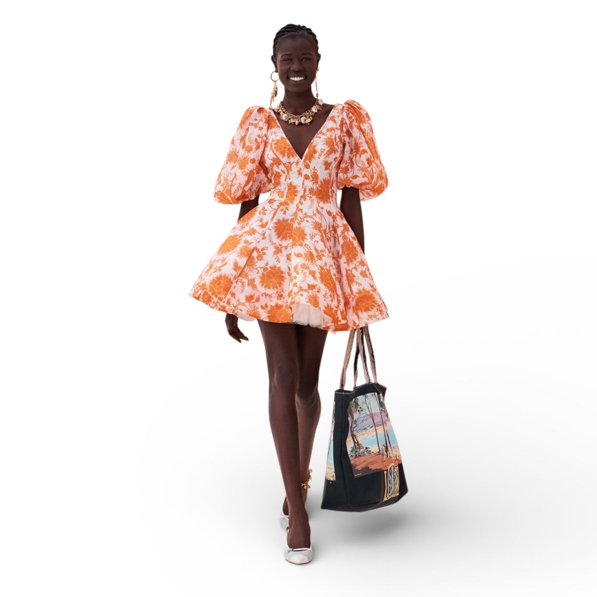 A silk linen organza mini dress in orange tonal floral featuring elbow length blouson sleeves with elasticated cuffs and panelling throughout