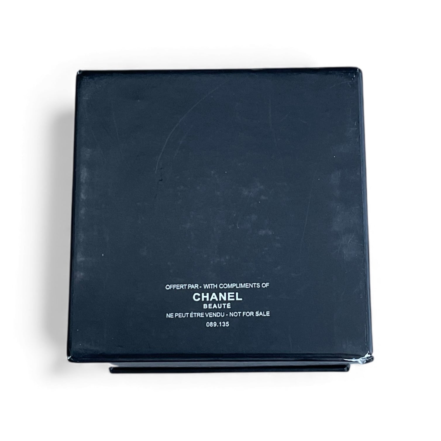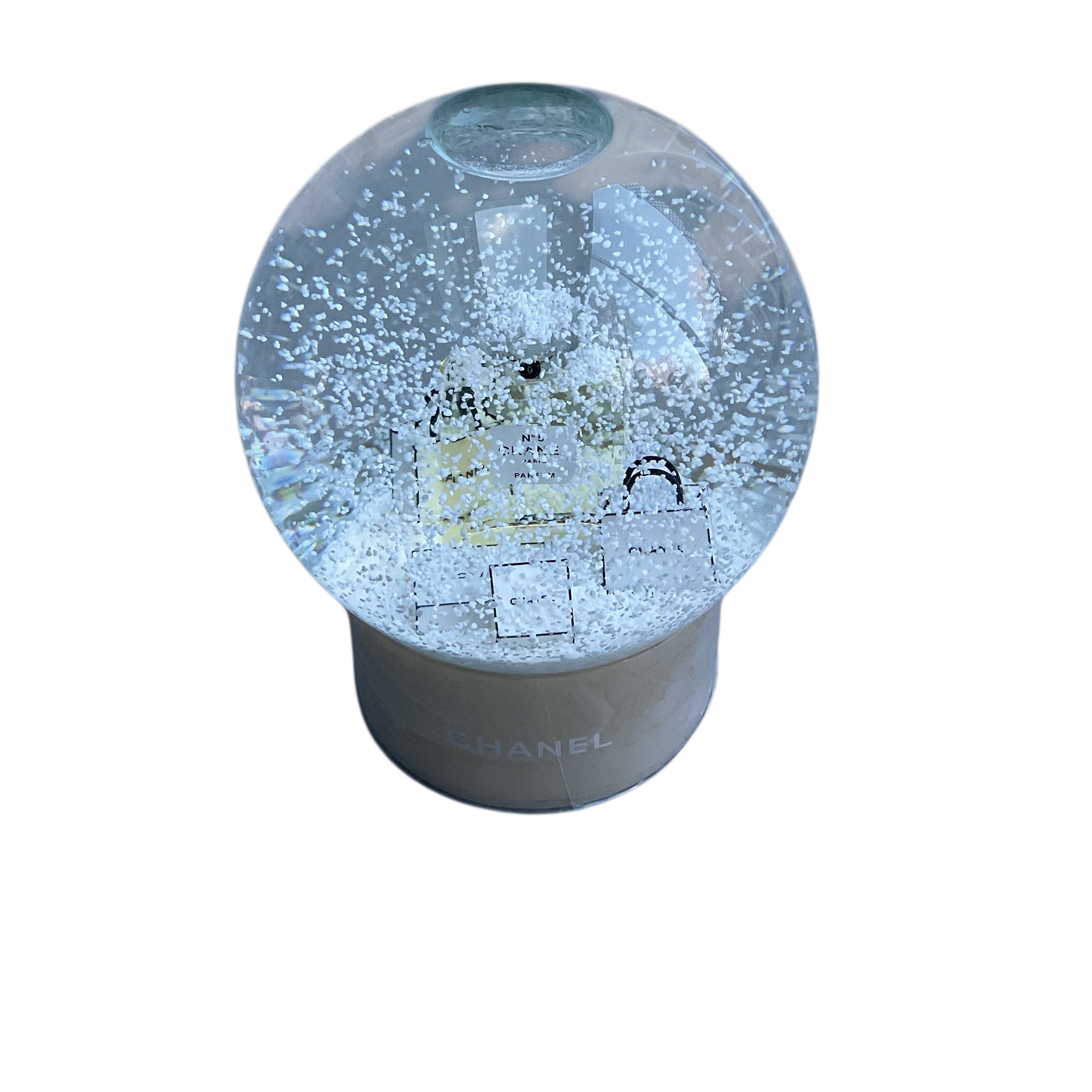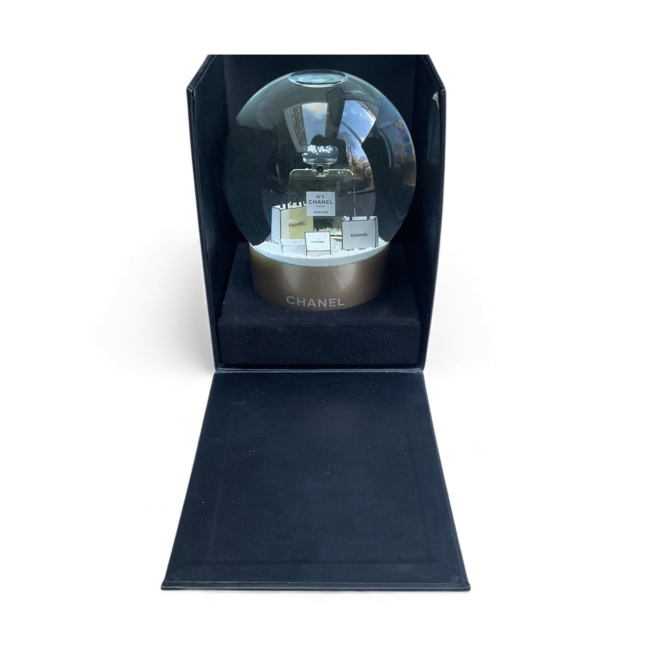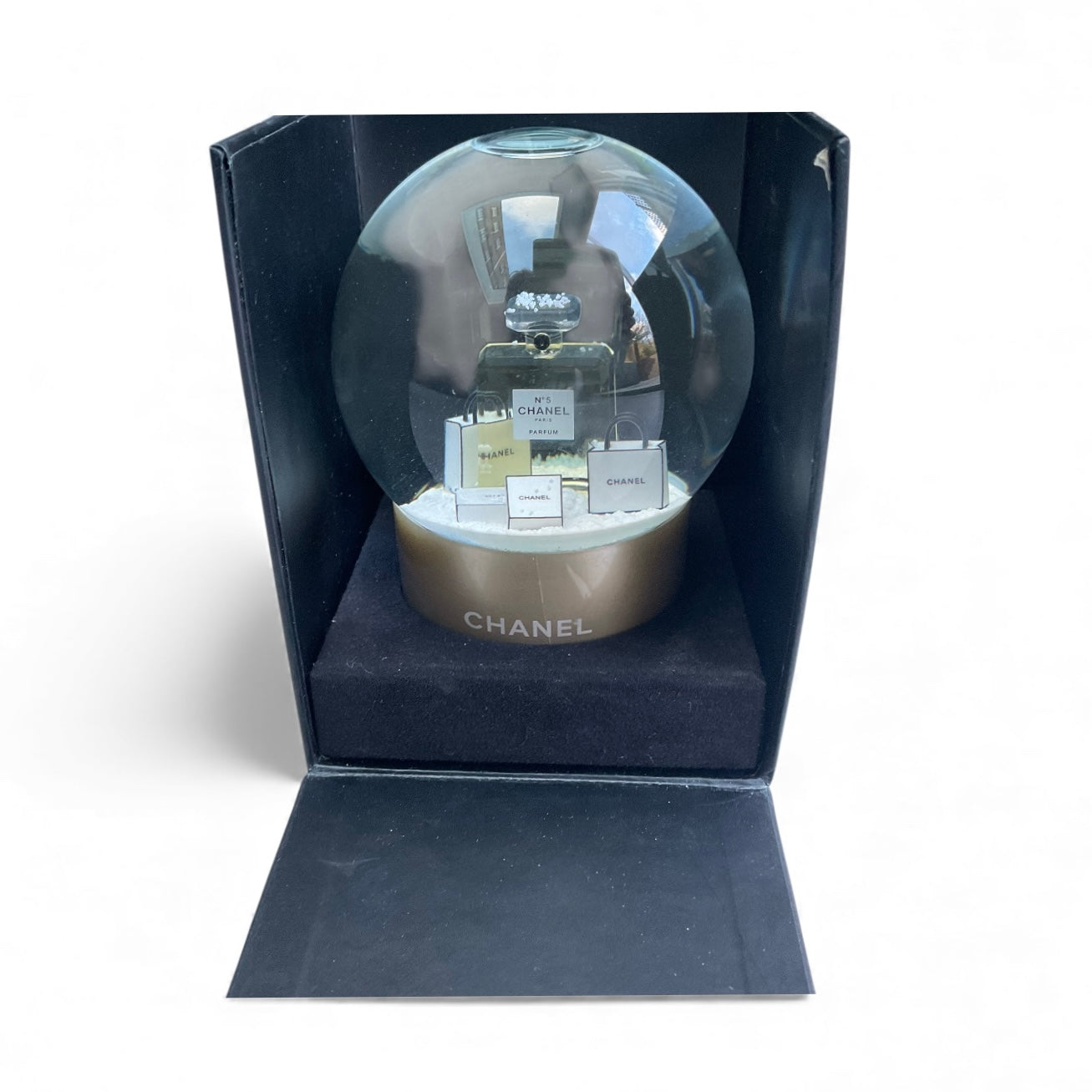 Chanel snow globe in transparent glass and gold plexiglass featuring a bottle of Chanel N.5 and little shopping bags